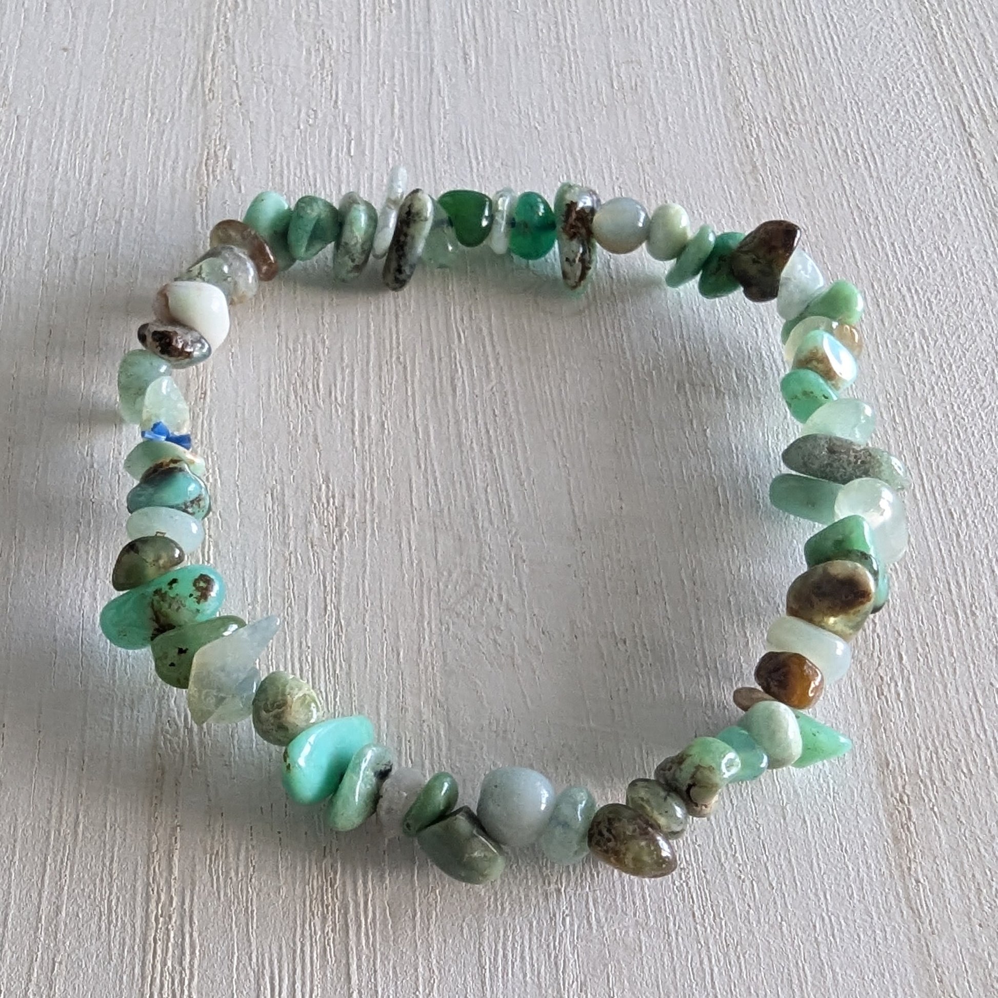 7" Chrysoprase Chip Bracelet. Bracelet purchased will be very similar to the one pictured. Each bracelet comes with its own description card.